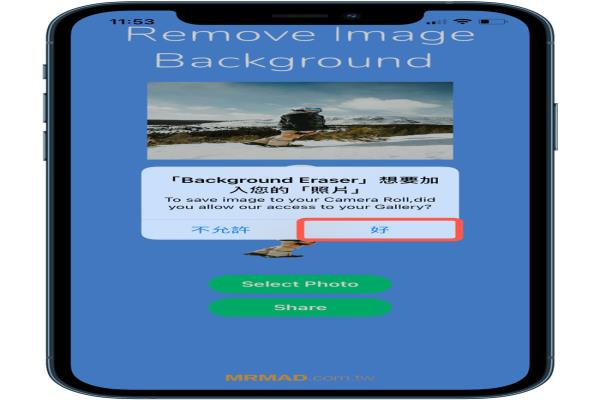 储存过程中,也会跳出确认要让BackgroundEraser存取照片,点击“好”即可。