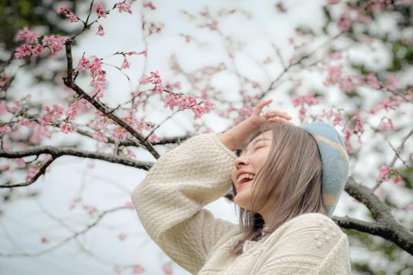 想要人与樱花同时入镜,最常见的就是仰角拍摄,还能顺道避开都市中经常有点杂乱的街景、人潮。