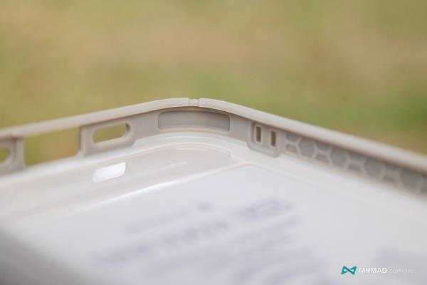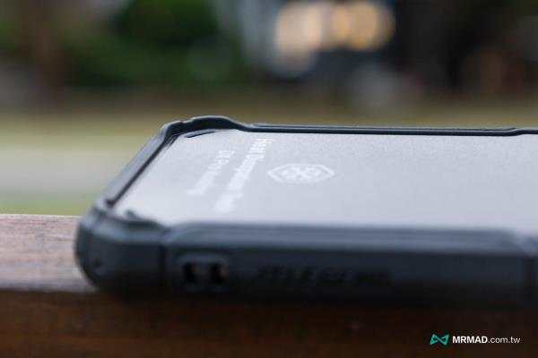 在四个角落也有额外加高设计,能够让iPhone放在桌上时,不会造成镜头部分或其中一边比较高,避免出现跷跷板或保护壳背板经常会摩擦地面情形。