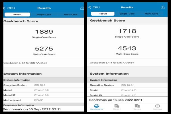 《Geekbench5》部分,iPhone14ProMax单核1889、多核5275;iPhone14单核1718、多核4543分
