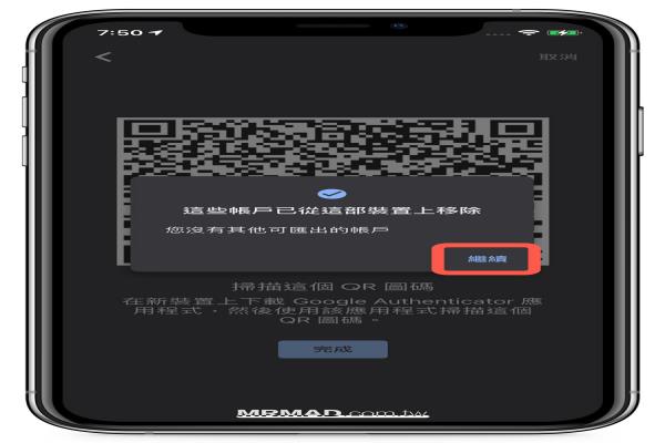 当GoogleAuthenticator转移完成后,回到旧款设备上点下“完成”,会跳出要移除已汇出的帐户吗?点击“移除帐户”即可。