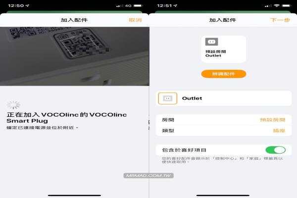 加入配件过程只要将镜头对准QRCode条码,就能够加入,有些VOCOlinc智能插头可能会发生找不到,直接压侧边电源键约五秒关机,在开启电源就可以搜索的到,加入配件后就可以直接自订名称、类型,最后按“下一步”即可
